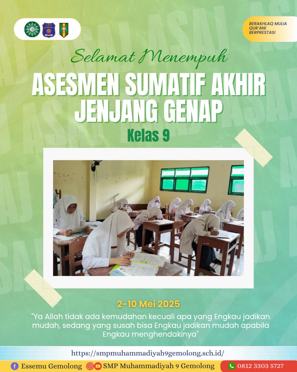 Senin - Jumat, 22-26 September 2025, SMP Muhammadiyah 9 Gemolong melaksanakan kegiatan ASTS semester 1 bagi siswa-siswi kelas 7-9. Selamat melaksanakan ASTS Gasal bagi siswa-sisw